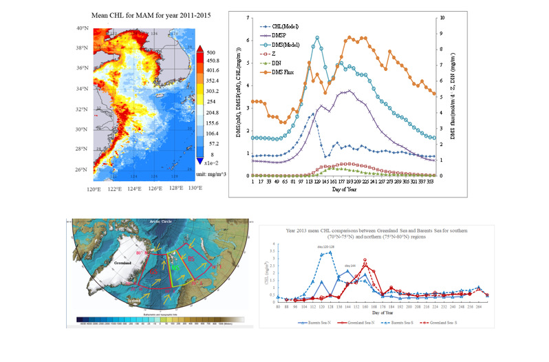 这些研究利用地球生物化学模型,首先预测了当代和4倍二氧化碳期间(一百年内)的中国东部陆架海域的二甲基硫(DMS)的海气通量。结合中国海洋大学提供的近年来的DMS的实测数据,利用遗传算法优化叶绿素和DMS相关的模型参数获得更实际的校准。用气候耦合模型CMIP5的数据用于预测4×CO2气候下研究地区的一些物理和生物量的变化。研究也发现,北冰洋北部较多的冰融化是导致叶绿素水华的主要原因。更早和更广泛的春季冰融化和持续的负北大西洋涛动(NAO)指数是2010年浮游植物大量繁殖的可能驱动因素。北冰洋的海冰融化与CHL呈正相关。