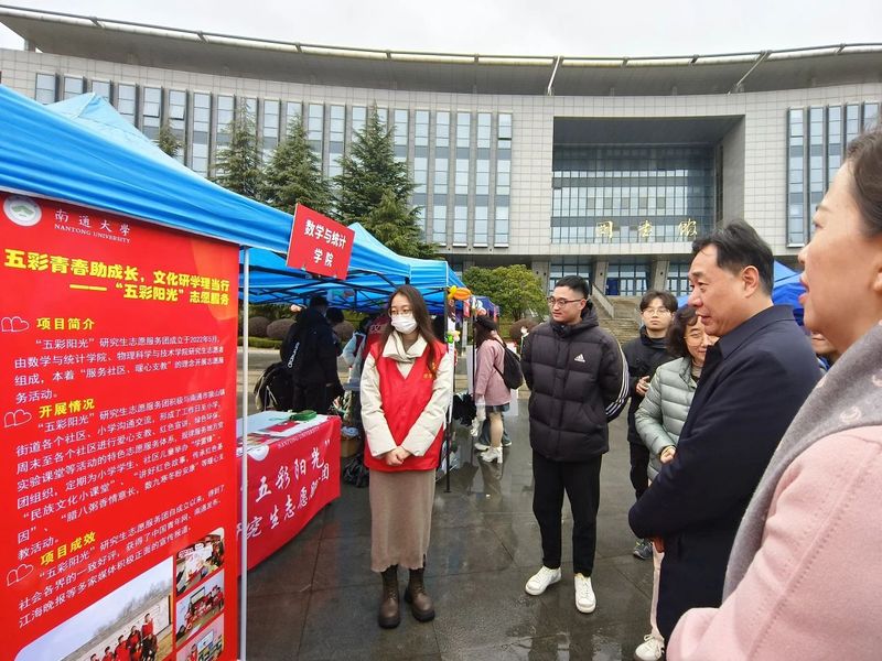 所属社团的负责同学向校党委常委、副校长吉明明介绍了学院相关志愿服务活动。“五彩阳光”研究生志愿服务团在校内通过举办寒假社会实践成果汇报会、研本引航“1+N”等活动,引导学生弘扬文明之风,传承雷锋精神;在校外,与南通市狼山镇街道南郊、临江、陆洪闸、三角桥、曹公堂等社区、小学沟通交流,为社区儿童举办“学雷锋”、“民族文化小课堂”、“温暖春冬”助残日等志愿服务。乐学课堂以雷锋精神为主题的举办了知识讲堂及雷锋精神知识竞赛,带领同学们了解、感悟、学习雷锋精神。摊位还设置了有奖答题环节,为同学们准备了精美的雷锋精神纪念品,并现场播放有关雷锋精神的视频。