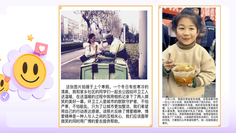 活动中,同学们充分发挥创造力与想象力,共征集到30余幅摄影或绘画作品。灿若朝霞孩童、可爱调皮云朵笑容可掬小狗、坚守岗位的医生、奉献青春的学生……一幅幅作品饱含着同学们对美好生活的期待与向往述说着无声的爱与温暖评审,统计212班李俊佳荣获一等奖作品分享了动物、孩子家庭的微笑,定格的笑容背后传递着浓浓的情感和温暖的故事;数师231班谢环羽、数师232班陈晓菲荣获二等奖其作品分别展现了医者仁心,以及青年志愿者以青春之我向老人传递关爱的赤忱之心;数师232 班董舒楠、数师定向221班王璐、数师231邱薛奕荣获三等奖其作品呈现了笑对自然灾害的小女孩、医护卡通形象给环卫工人传递温暖的学生