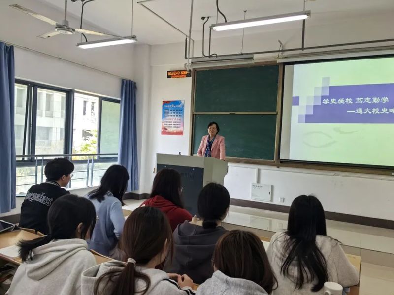 授课期间,陈玉娟副校长围绕学校历史脉络展开讲解。她从张謇先生创办私立南通医学专门学校与南通纺织专门学校讲起,详细阐述学校在不同历史阶段的发展情况,包括历经的变革、融合等,让同学们对学校从最初创办到发展为综合性大学的过程有了清晰认识。