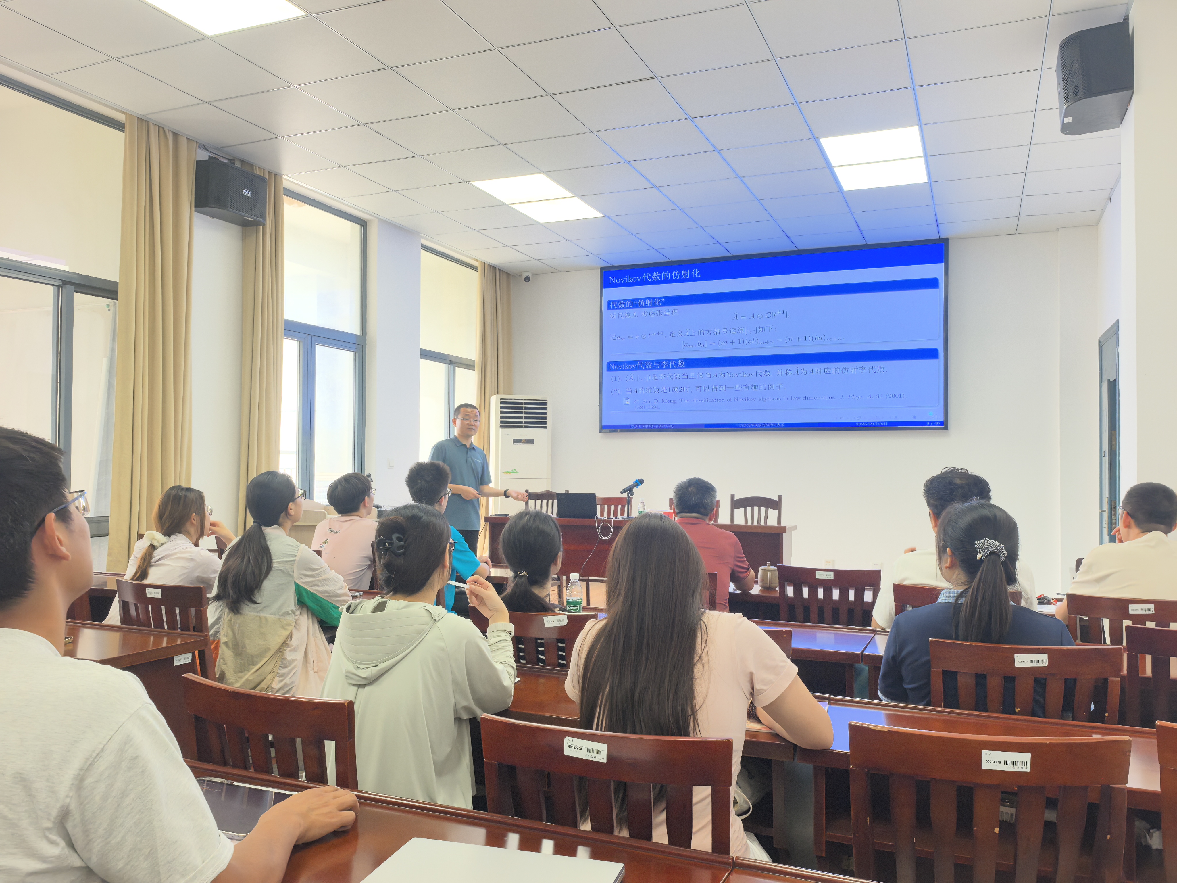 陈洪佳教授介绍了无中心扭 Heisenberg-Virasoro 代数的一类形变李代数以及在其结构与表示理论方面的研究进展,具体包括确定这类李代数之间的同构关系、刻画其导子空间与泛中心扩张结构,并对U(H)秩为1自由模进行完整分类与模结构分析。在报告中,陈教授凭借自身丰富的科研与工作经验,对数学科研给出了许多独到见解,并对青年科研工作者给出了诸多宝贵意见。