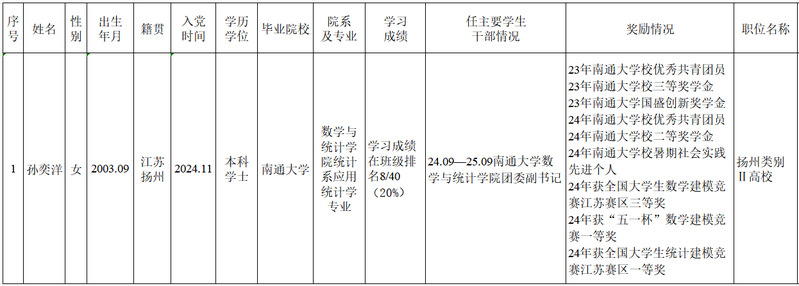 根据《江苏省2026年应届优秀大学毕业生选调工作公告》及学校相关工作要求,经个人申报、学院资格审查、综合考察等程序,拟推荐孙奕洋同学为江苏省2026年应届优秀大学毕业生选调人选。现将有关情况进行公示。公示时间:2025年10月17日-10月21日。