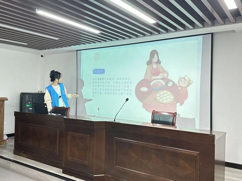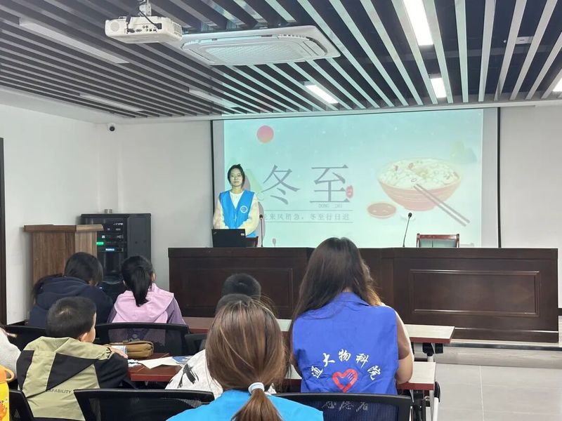 在民俗分享环节,南北各异的冬至习俗更是引发了孩子们的浓厚兴趣。志愿者细致讲解了北方吃饺子“消寒”的民谚、南方吃汤圆“团圆”的寓意,还有山东羊肉汤的传说、两广烧腊与吴川姜饭的特色,这些鲜活的民俗故事,让孩子们深深领略到传统节日的独特魅力。