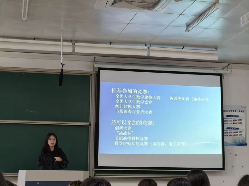 统计232班程佳可为同学们揭开了学科竞赛与科研项目的神秘面纱。她创新地将竞赛分为“夯实基础的必修课”——专业核心类竞赛,和“拓展边界的选修课”——跨学科创新类竞赛,并分享了从“模仿”文献到找到自己“科研火花”的实用步骤,鼓励大家主动出击,寻求导师指导,在科研竞赛中提升综合能力。