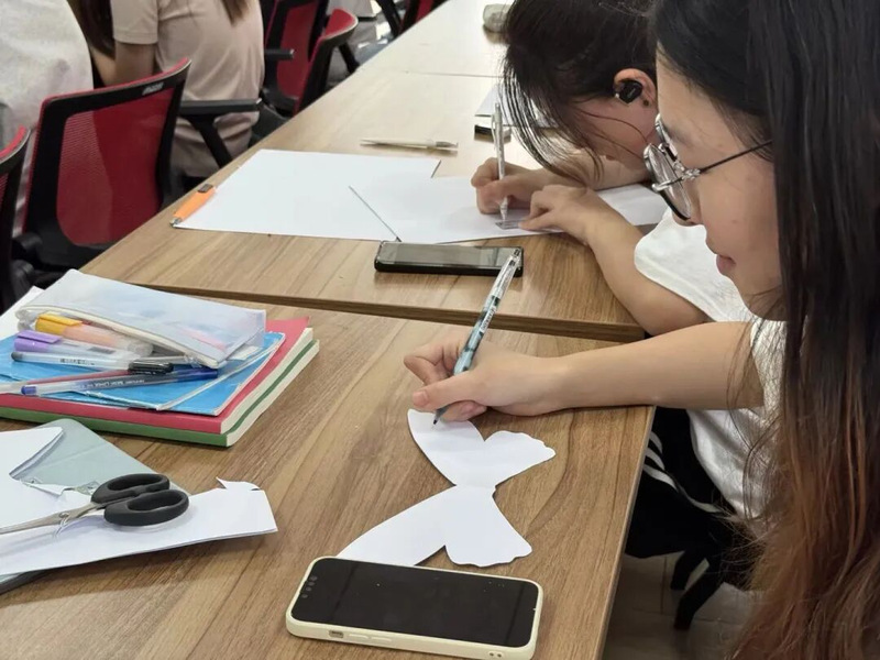活动现场,同学们循着“绘梦-裁韵-刻情-映光”流程沉浸式创作:或绘灯笼、蝴蝶、瓢虫与几何图形,再以玻璃纸赋予其气韵与温度;随后剪轮廓、刻细节,让缠枝莲纹、翅脉肌理等在刀尖渐显;最终覆纸映光,光线穿透时,传统与生活意象化作斑斓光簇,每件作品都凝萃着巧思与热忱。