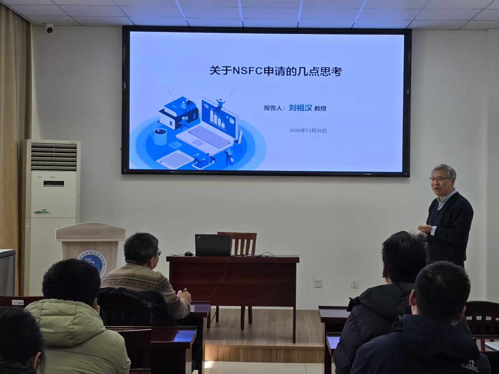 为切实提升2026年度国家自然科学基金项目申报质量,助力青年教师成长,2025年12月26日,我院特邀扬州大学数学科学学院刘祖汉教授来院,为拟申报2026年度国家自然科学基金项目的教师作专题辅导。学院领导、科研骨干及全体申报教师参加本次活动。
