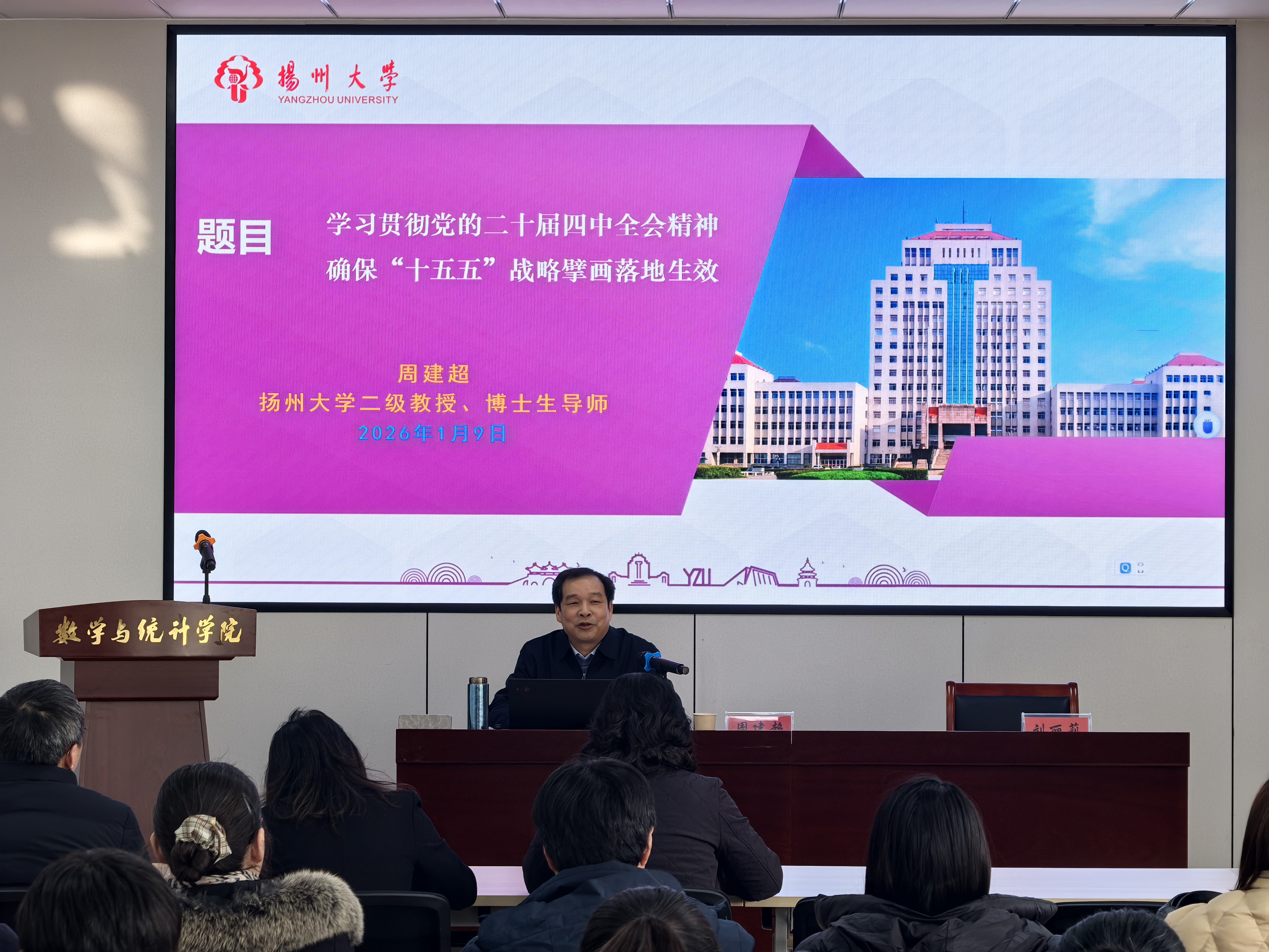 为深入学习贯彻党的二十届四中全会精神,切实将全院师生的思想和行动统一到全会决策部署上来,2026年1月9日下午,我院举办党的二十届四中全会精神专题辅导讲座,邀请扬州大学二级教授、博士生导师周建超教授作专题报告。报告会由学院党总支书记刘丽莉主持。